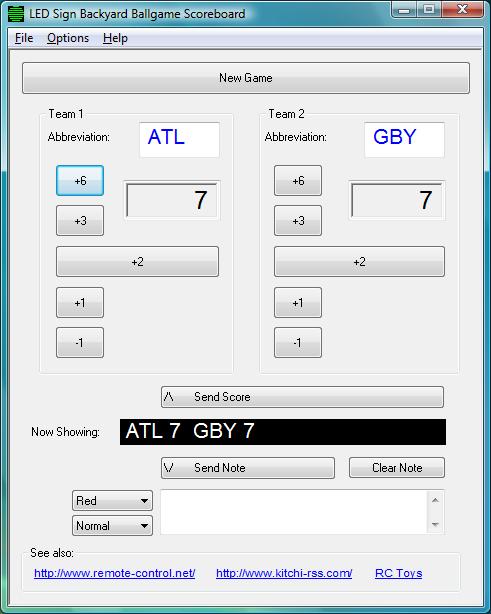 This program is general enough to work with various types of sports. It also lets you write temporary messages to the LED sign (while continuing to keep score) and then resume showing the current score.